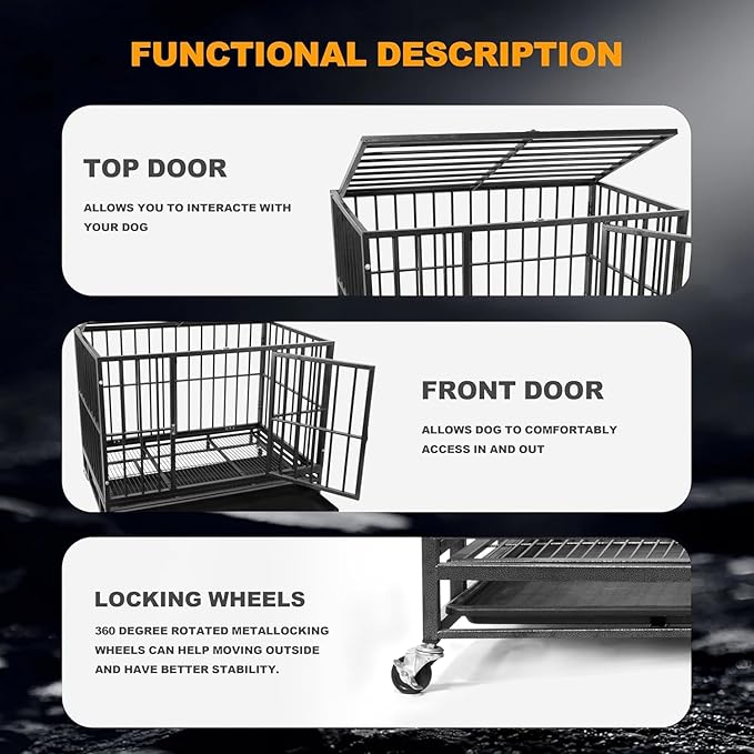 - 【Simple Setup & Mobility】With 4 lockable, 360-degree swivel wheels at the bottom, moving the dog cage around is a breeze. Lock the wheels to ensure stability and security. Most parts of the dog kennel come pre-assembled, requiring only minimal effort to complete the setup, making it a hassle-free experience for pet owners.