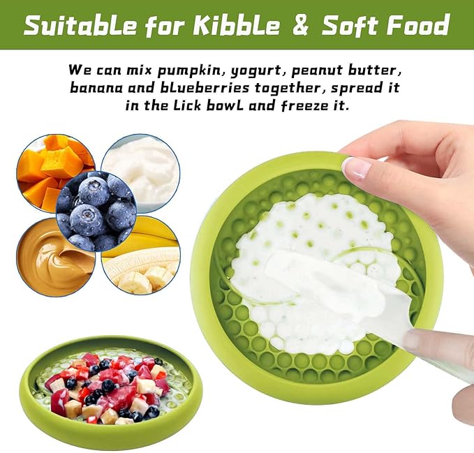 - Simple and Practical Design: It is bowl-shaped, with reasonable depth, flat bottom to reach, licking pad design, food-grade silicone material, sturdy and durable. Good depth of the grooves to hold in little treats. The curved edge design of the licking bowl reduces food drops and keeps the house clean.