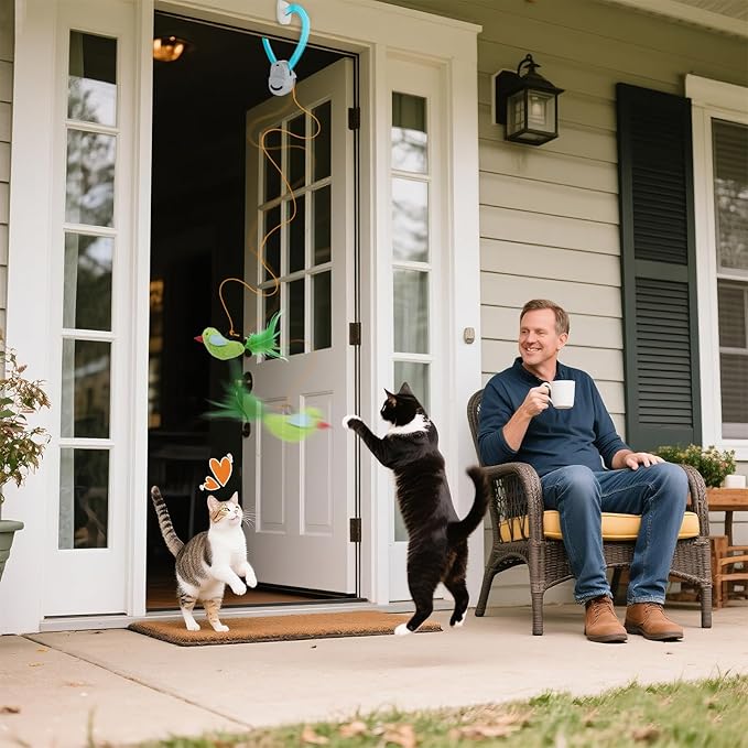 - Cat Interactive Toys Fun – Hanging for Multi-cat stimulation toys for indoor cats Hanging mode (elastic string + cat flying bird toy) to prevent boredom. cat entertainment for indoor cats, exercise, and reducing destructive behavior in indoor cats-cat enrichment toys for indoor cats. Hanging bird toy for cats is suitable for kittens and adult cats. The automatic cat toy for doorway stimulates cats' hunting instincts and agility.