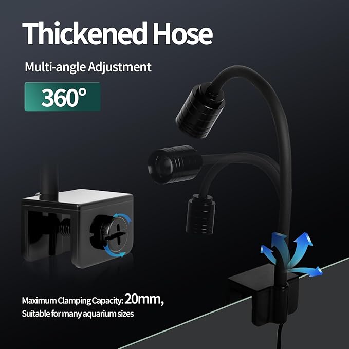 - Multi-Angle Adjustment & 720° Rotating Silicone Tube allow full customization of light direction; beam angle adjustable from 15° to 60° for focused or wide-area lighting coverage in freshwater and saltwater tanks.