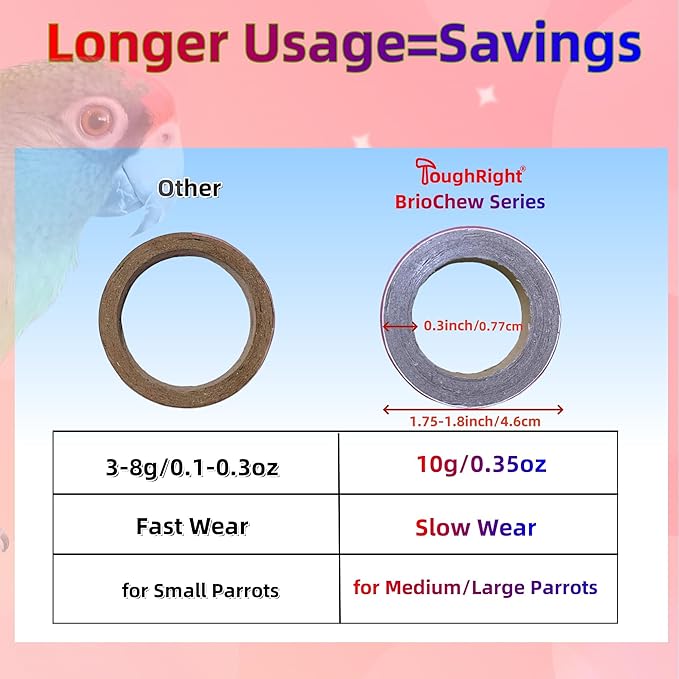 - Bird-Safe, Non-Toxic Fun: Made from 100% bird-safe materials, these chew rings are as safe as they are engaging. With ToughRight, you get peace of mind knowing your feathered friend is chewing on quality materials without any risk.