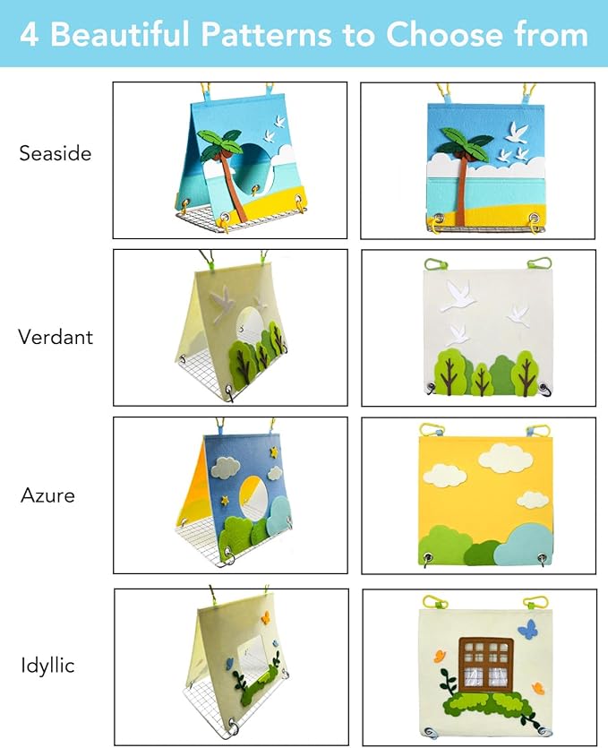 - Four Pattern Available: Choose from nature-inspired designs: "Idyllic" Cottage, "Seaside" Coast, "Verdant" Forest, or "Azure" Sky.Choose one to refresh your bird's habitat with visually stimulating, calming hideaways.