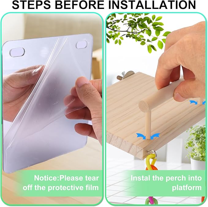 - 【 Acrylic Mirror & Pine Perch Duo】 -Features a shatterproof acrylic mirror (protective film pre-attached) + natural pine platform which preserving natural textures, and being easy to clean, long-term use is not prone to deformation.