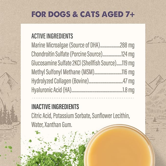 - MAINTAIN JOINT MOBILITY. Glucosamine, chondroitin, collagen, hyaluronic acid, and MSM help to support maturing pets’ mobility.
