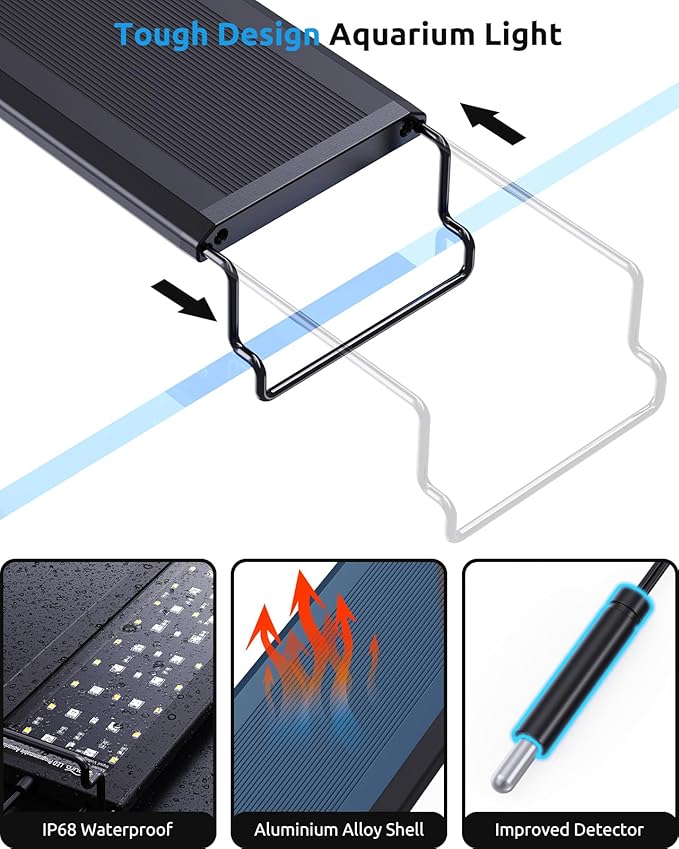 - 🐟 Taller Retractable Stand: Seaoura aquarium lights come with adjustable mounts and are available in application sizes from 18 to 24 inch to fit lights on fish tanks from 10 gallons to 20 gallons. Cord length: 7.2 ft. The light board has a silicone coating and is waterproof IP68. The aluminum housing ensures heat dissipation efficiency. Smart power saving mode will auto turn off the background light of the LCD screen between 11:30 p.m. to 07:00 a.m.