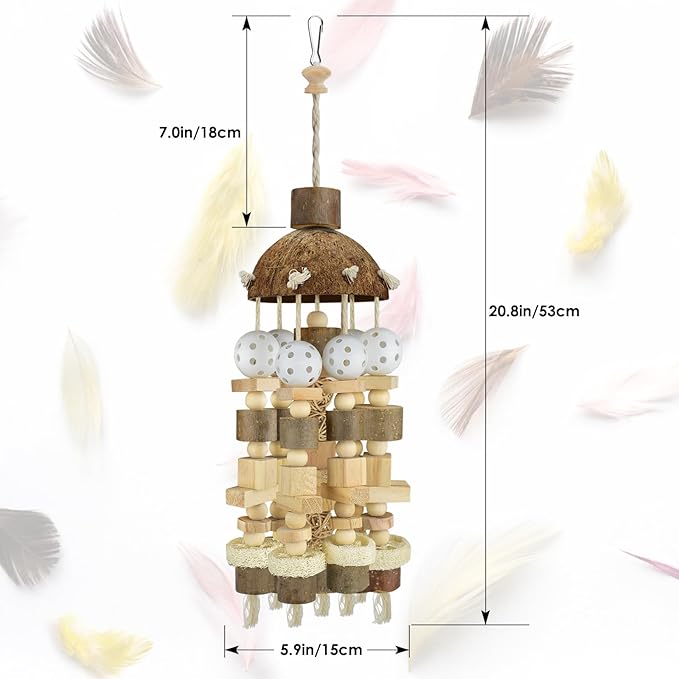 - SAFE TO CHEW: This 2 pieces of bird cage accessory toys is made of natural wooden blocks, coconut shell, nutshell, plastic gear, bamboo branch, stainless chain, loofah and wadded rope, non-toxic ABS materials and dyed with edible pigments, safe and durable. Your pet birds can play and enjoy them without any worries