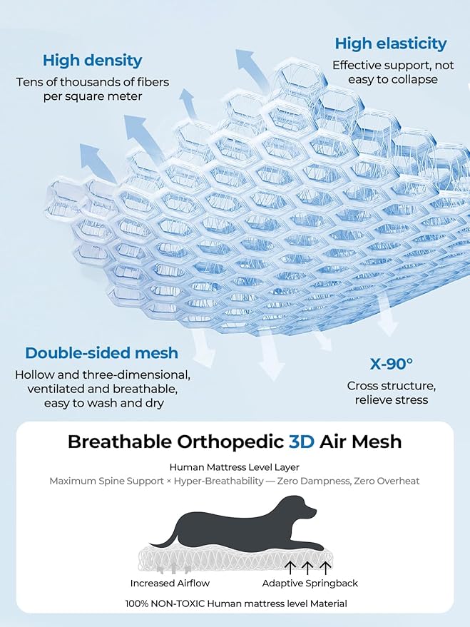 - 🐾[COOLING SYSTEM & BREATHABLE MULTI-LAYER DESIGN]: One side of the mat’s surface features a Qmax >= 0.5 cooling fabric to instantly draw away heat. Inside, a 1cm(0.4inch) thick 3D air mesh layer enhances ventilation, while 400gsm firm cotton provide balanced softness and spine support, achieves 327CFM airflow (173% better than regular mats), maintains <55% humidity for 12hr continuous use. Total thickness approx. 1.4 inches (3.5cm) for optimal comfort and structure.