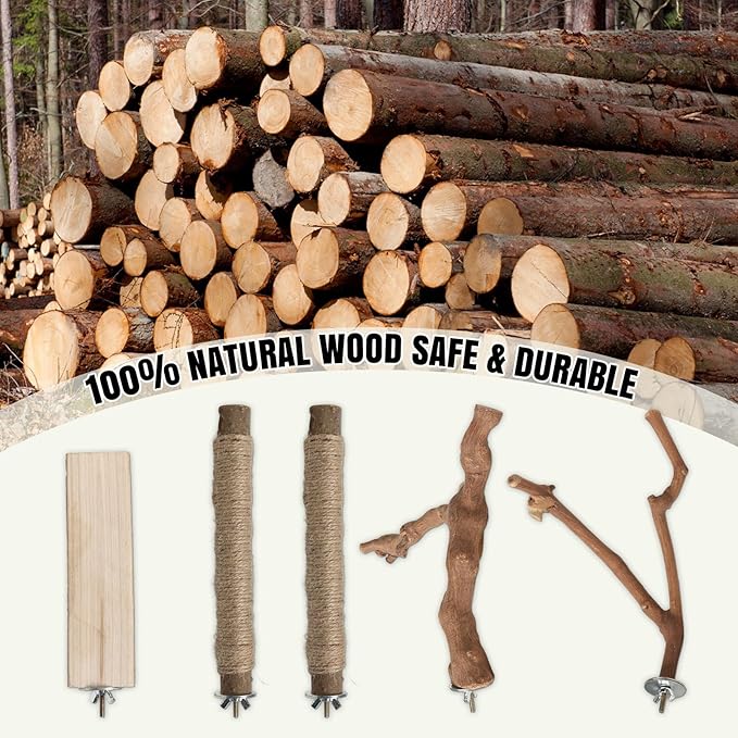 - Bird Cage Accessories: The bird perch set includes 5PCS versatile perches: 2 Y-shaped grapevines (9.8’’), 2 rope-wrapped stands (8.3’’), 1 platform (6’’ x 4’’). Note: Due to the fact that the perches are made of natural wood, individual shapes may vary.