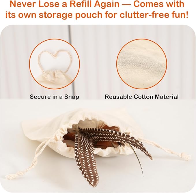 - 5. Your Complete Play Kit - Never Lose a Refill Again! Includes a reusable cotton storage pouch to keep all parts organized and easy to find—no more missing attachments! The wand folds into down to just 5.12", making it easy to store or travel with. Thoughtfully packaged and easy to gift, it's a practical and charming choice for your playful kitten.
