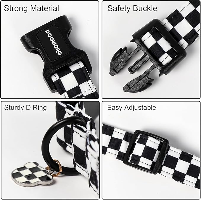DOGWONG Checkered Dog Collar, Black Plaid Dog Collar Adjustable Soft Natural Fabric Pet Dog Collars Cute Puppy Necklace for Small Medium Large Dogs