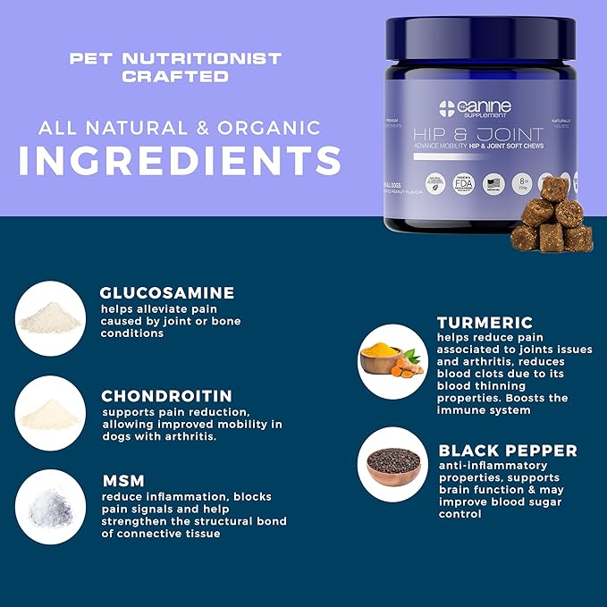 - SUITABLE FOR ALL DOGS & DAILY USE: Safe and gentle for puppies, adults and senior dogs. These soft chews are pet nutritionist crafted, naturally holistic and made to support hip health, stiffness and overall joint function. Serve daily as a treat or crumble into meals, dogs love the roasted peanut flavor and easy-to-chew texture.