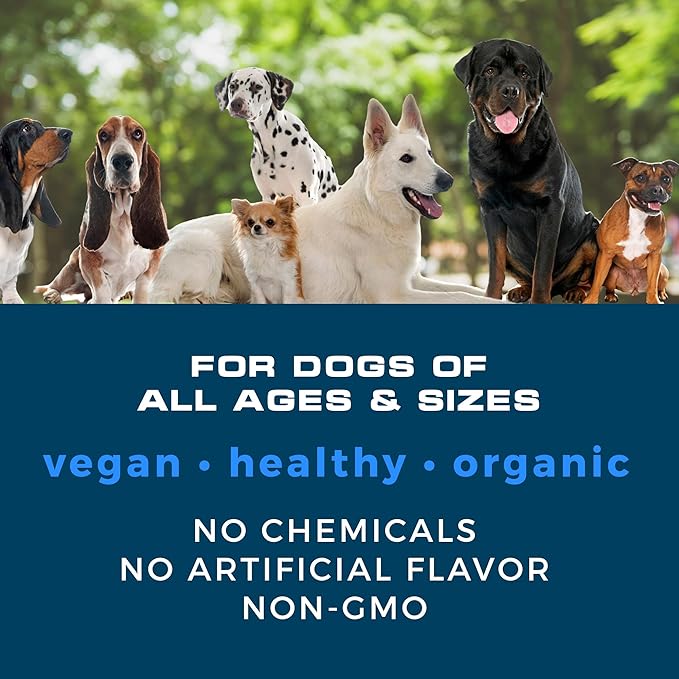 - SUITABLE FOR ALL BREEDS & SIZES: Formulated for small, medium and large dogs, from playful puppies to senior companions. These vegan, grain-free, non-GMO chews are free from chemicals and artificial flavors. Serve daily as a treat or crumble into food. Supports skin, coat, eye and urinary health. No wheat, corn, soy or artificial additives.