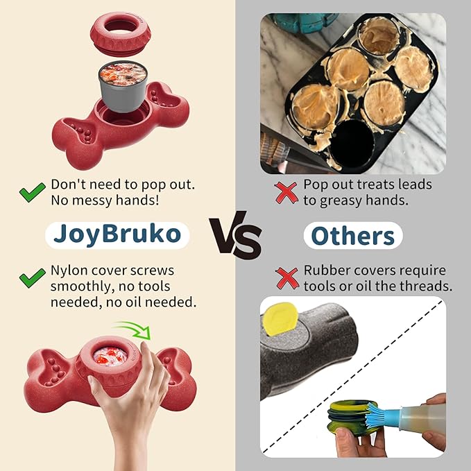 - Mess-Free Frozen Treat Dog Toy with Separate Treat Mold Cups - No need to pop out the frozen treats from a mold tray. Just put the treat mold cup with frozen treat directly in the toy to avoid getting sticky/greasy hands. And the treat mold cups come with lids, which will prevent odors from spreading in the freezer!