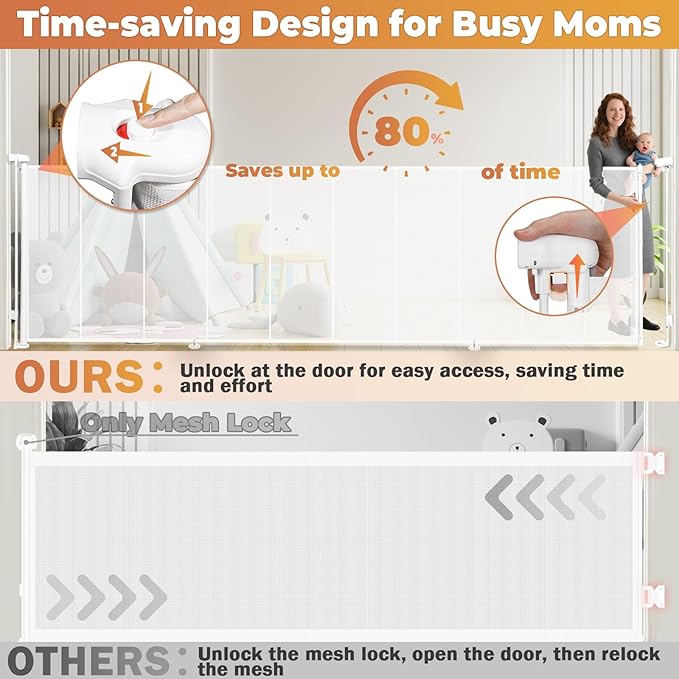 - 【Convenient Lock Design for Busy Moms】This retractable mesh gate features a unique design with separate mesh and door locks, allowing you to easily open and close the gate at the entrance without having to unlock the mesh first. Unlike other retractable baby gates that require you to unlock the mesh before opening the door and relock it afterward, our gate saves valuable time for busy moms! Additionally, the one-touch unlock design of the mesh lock lets you easily lock and unlock with just a fingertip. These thoughtful features are perfect for moms on the go!