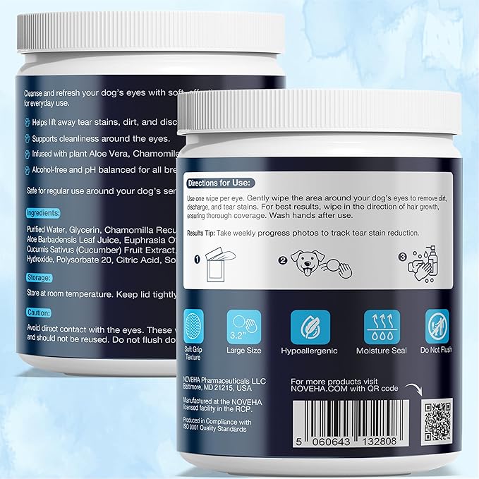 - 🌿INFUSED WITH NATURAL INGREDIENTS - Aloe Vera, Chamomile, Eyebright & Cucumber Extract. NOVEHA eye wipes for dogs are Alcohol-free and pH balanced for all breeds and coat colors.