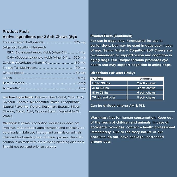 Senior Dog Vision and Cognition Chews - 60 Soft Chews for Dog Eye Care and Memory - 7-in-1 Multivitamin with Omega Fatty Acids, Vitamins, and Botanicals - Made in The USA
