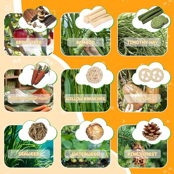 - 【Dental Health Protection】Natural apple wood branches and sweet bamboo sticks provide optimal rodent chew toys resistance to control tooth overgrowth; fibrous hay sticks and chewable pine cones satisfy natural gnawing instincts while promoting dental hygiene; edible carrot snacks redirect chewing urges away from furniture.