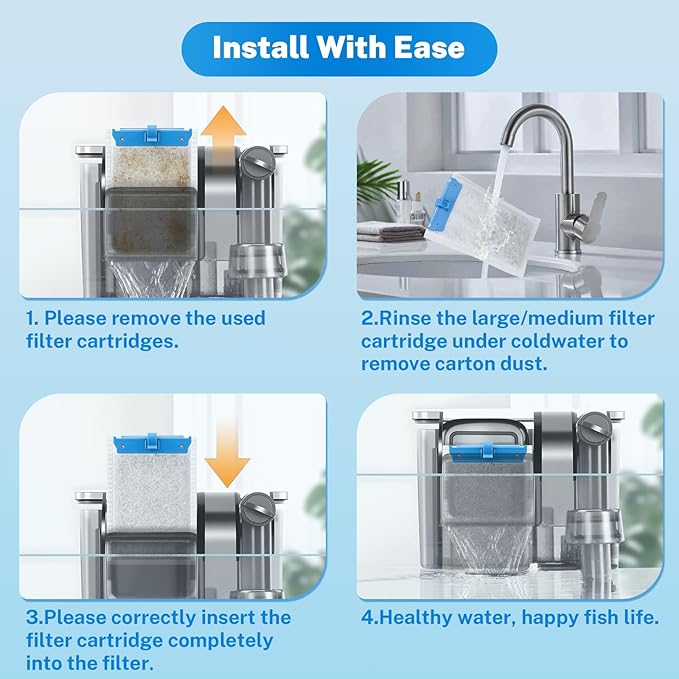 - 4-in-1 Power Filtration for Crystal-Clear : We built these cartridges to tackle every aquarium mess. Dual-sided dense mesh: Traps debris, uneaten food, and fish waste before they cloud your water. 40% more activated carbon: Lasts longer to eliminate odors, yellowing, and impurities—keeping glass free of scale. Ceramic beads: Absorbs heavy metals and improves water quality for happier fish and plants.