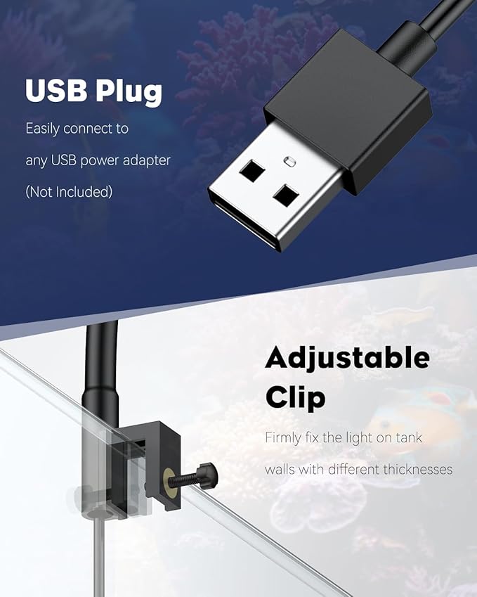 - Easy to Use: Perfect for marine tanks from 1 to 3 gallons! With a 3-foot USB cable (adapter Not included), the DC-powered LED aquarium light runs continuously throughout the day. Featuring a flexible gooseneck, it can be twisted to shine at any angle