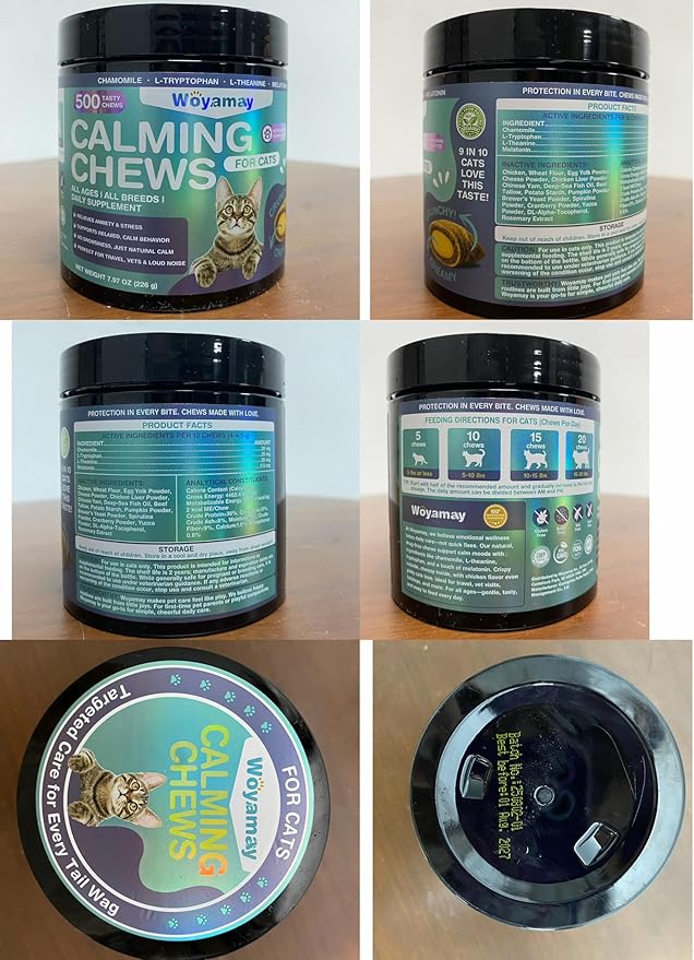 - RELIABLE & NATURAL CALMING SUPPORT: Woyamay calming cat treats are pet-tested, researched, and recommended by pet owners. Each chew contains natural relaxation support ingredients such as Chamomile, L-Tryptophan, L-Theanine, Melatonin. A gentle yet supportive way to care for cats of all ages and breeds, providing daily support & lasting relaxation to help your cat relax in stressful situations.