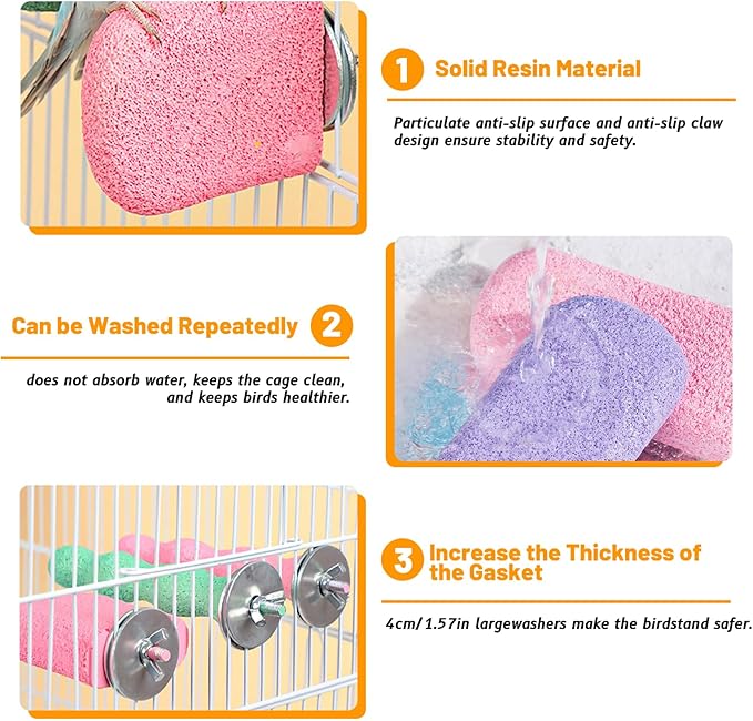 - Premium Material: Bird perches are crafted from porous resin infused with high-calcium volcanic rock, free from impurities and odors. This design aids parrots in calcium supplementation and absorption while meeting their nutritional needs. The perches are also easy to clean—simply rinse with water to maintain cage hygiene, creating a healthy living environment for your parrot.