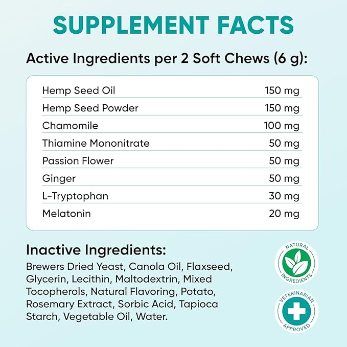 - QUALITY INGREDIENTS: These calming treats for dogs crafted with premium ingredients like hemp seed oil, chamomile, melatonin, and L-tryptophan for effective anxiety and stress relief and promoting calmness in your beloved pet