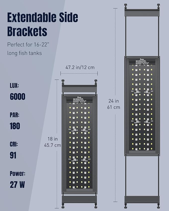 - For 16"-22" Tanks: Extendable side brackets (18-24" length) fit tanks of 16-22" long. Adjustable screws on each bracket let you set the perfect height for your aquarium. Handy top holes make hanging easy with compatible tank hooks or mounting accessories