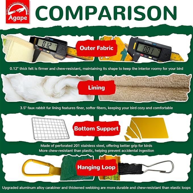 - 【Material+】 The bird nest features a felt fabric exterior that’s sturdier and more chew-resistant than regular cloth. The lining is made of soft faux rabbit fur for extra warmth and a smooth touch. The upgraded bottom support uses a stainless-steel wire mesh instead of plastic, preventing breakage and protecting your bird’s health. The mesh design offers better grip for standing and contains no cotton padding, eliminating the risk of loose fibers tangling your parrot’s feet or neck