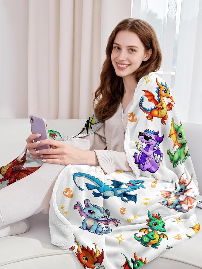 - Cute Dragon Design – Featuring adorable dragon patterns, this dragon throw blanket brings charm and personality to your home decor. Perfect for dragon lovers, it adds a playful yet cozy touch to your living room, sofa, or bedroom.