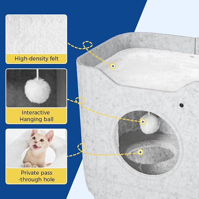 Cat House for Indoor Cats Large Cat Bed Cave 2-Storey Cats Condo with Cozy Felt Covered Hideaway for Multiple Pets Light Grey